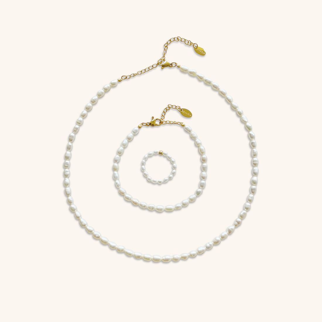 The Pearl Trifecta Bundle is a lustrous combination of a choker, bracelet, and a ring...