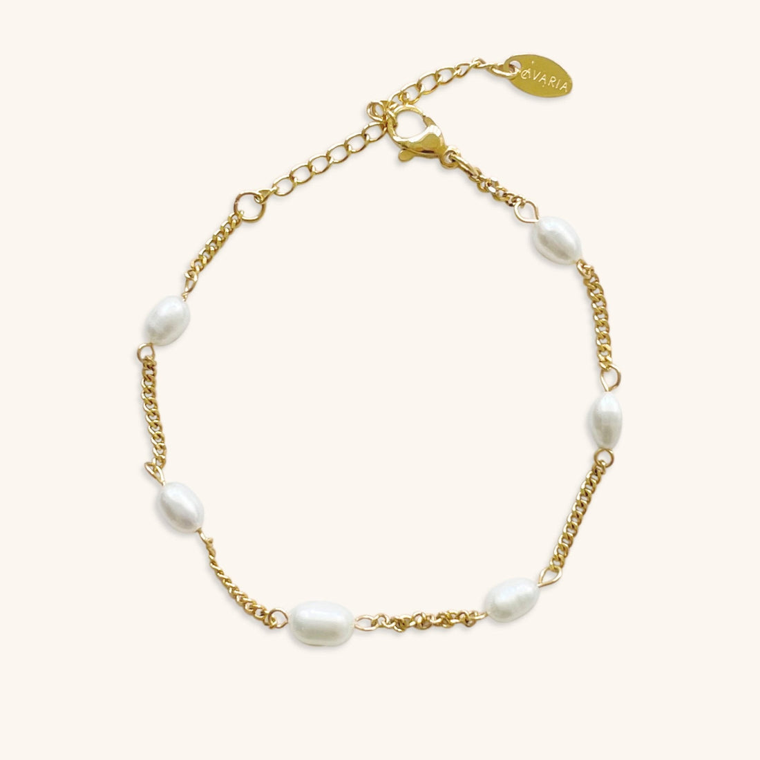 Sami. A stunning bracelet that features a band of captivating pearls clustered in a delicate gold chain. A...