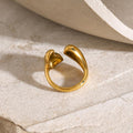 Where Geometry Meets Glamour. AVARIA's Abstract Gold Ring is the perfect example of modern chic. Its clean lines and elegant curves create a striking visual impact that's both sophisticated and playful. Hypoallergenic and waterproof for worry-free wear as always.