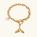 A delicate chain bracelet inspired by the wonders of the ocean. With two spaced-out pendants—a gold mermaid's tail and a freshwater pearl—this piece captures the essence of seaside charm. Made from hypoallergenic, waterproof gold, it’s perfect for everyday wear and special occasions alike. Ethically sourced and beautifully crafted, the Bryne Bracelet lets you carry a bit of the beach with you wherever you go.