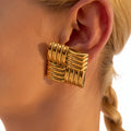 Introduce bold geometry to your everyday style with Cindy. These captivating square earrings, crafted from luxurious 18k gold. And yes, they're 100% waterproof too. If we were to describe its captivating facade in words, it showcases a mesmerizing criss-cross design that dances with the light, adding a touch of modern edge to any ensemble.