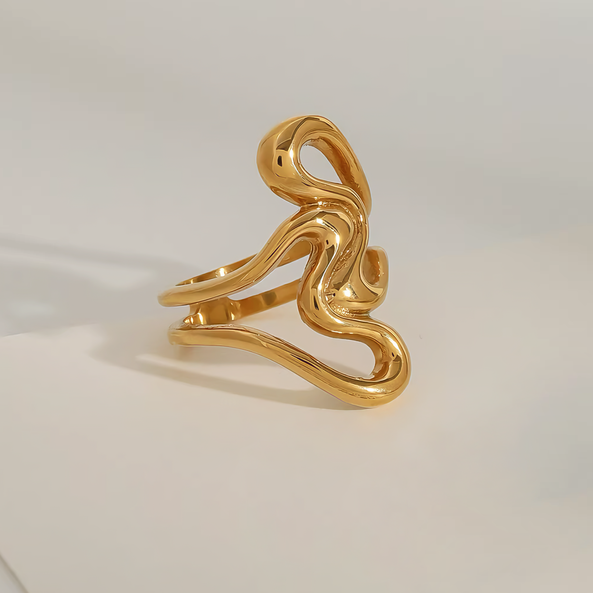 Dare to be different. Avaria's Corina is for those who like their jewelry with a side of personality. Bold, unexpected, and undeniably chic, this abstract gold ring is a piece as unique as you are. Available in both Gold and Two Tone. Waterproof, worry-free, and hypoallergenic, it's ready for anything.
