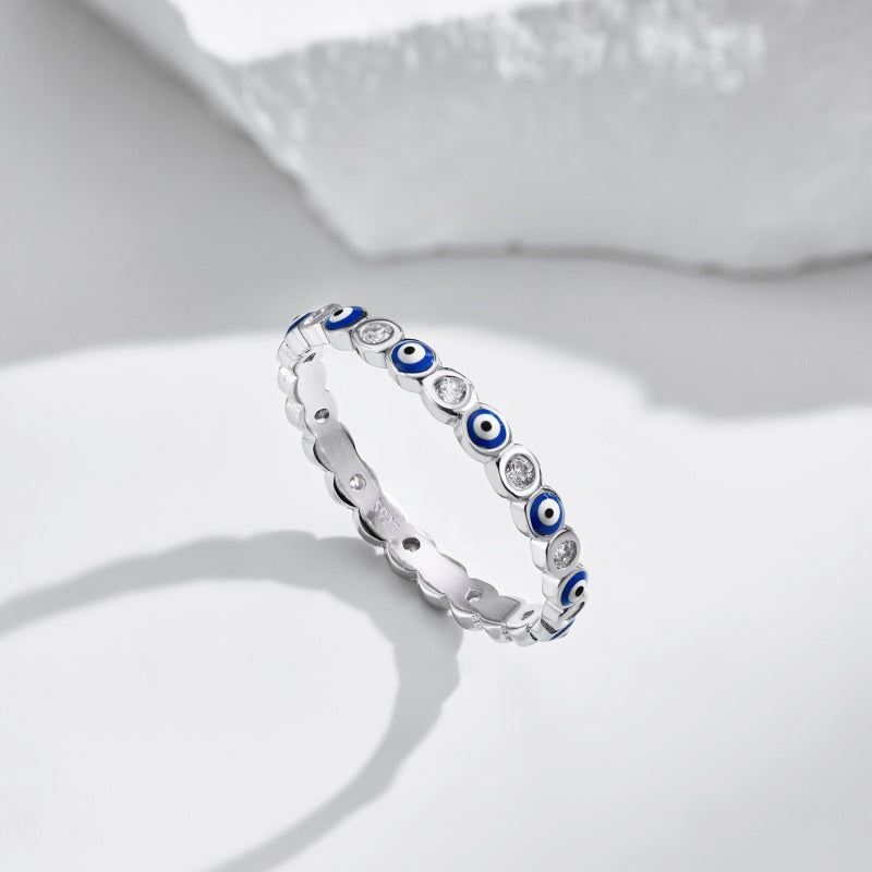 Ward off evil spirits with our beautifully crafted evil eye ring that will protect you for as long as you wear it. The deep rich navy blue reveal a sense of depth and intellect. The symbol of the evil eye is meant to rid negative energies and bring good fortune, while empowering you with a sense of security.