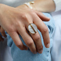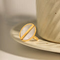 Embrace the captivating contrast of textures and forms with the Hadley Gold Ring, a piece that combines the timeless elegance of gold with the organic beauty of mother-of-pearl. Its open-ended design, featuring a luminous mother-of-pearl disc nestled within a polished gold band, creates harmonious interplay of glimmer making it a staple for every occasion.