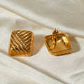 Modern simplicity infused with subtle texture. The Inez Gold Earrings showcase a sleek rectangular form crafted from 18k gold. Delicate diagonal engravings add a touch of understated elegance, perfect for everyday wear with a touch of sophistication.