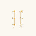 The Iris Diamond Earrings are a radiant pair that captures the light with every movement. Crafted from 18k gold, they feature a chain of diamond simulants that sway gracefully from the ear. The diamond simulants are synthetic stones that match the brilliance and fire of natural diamonds. An exquisite choice for any occasion and attire combination of your choice.