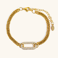 AVARIA's Kleo bracelet is an intriguing blend of boldness and elegance. The diamond-encrusted link, set against a substantial gold chain, creates a captivating contrast. It's for the woman who appreciates a touch of the unexpected. Waterproof, hypoallergenic, and undeniably striking.