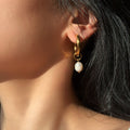 The Stella Pearl earrings are a classic and refined accessory that features a natural freshwater pearl hanging from a gold piece with an ever-so-radiant finish Perfect for any occasion that requires elegance and sophistication.